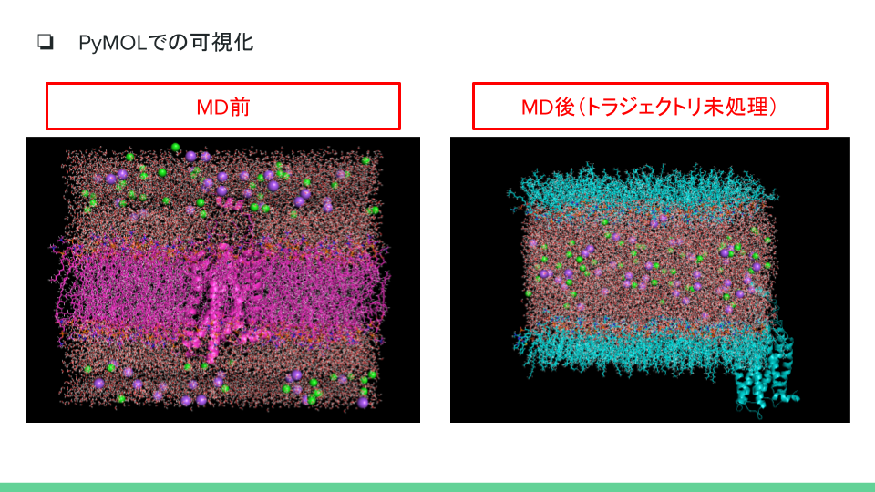 MDの結果を可視化する際、(ソフトウェアにもよりますが)未処理のファイルを読み込ませると分子がおかしな状態で表示されることがあります。