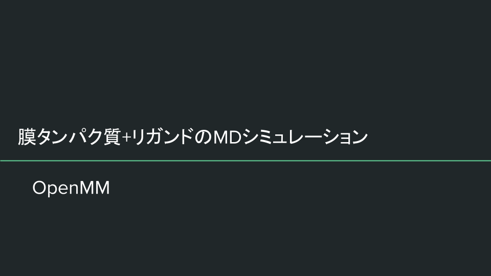 今回は、OpenMMを利用して、膜タンパク質とリガンドのMDシミュレーションを行います。